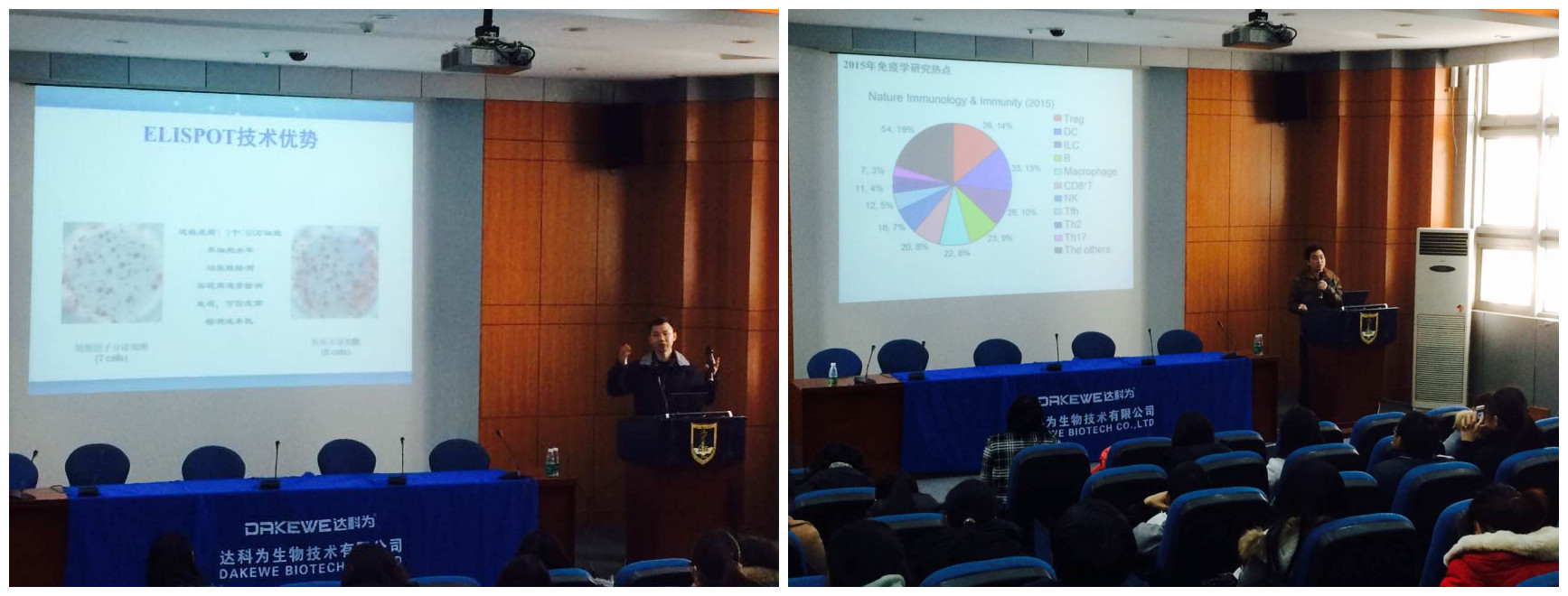18日上午九點,第二天的理論課程開始了。首先是科為生物工程中心周翔經理作報告。周翔經理講述了ELISPOT的原理、刺激劑的選擇、斑點結果判定以及ELISPOT的應用等。