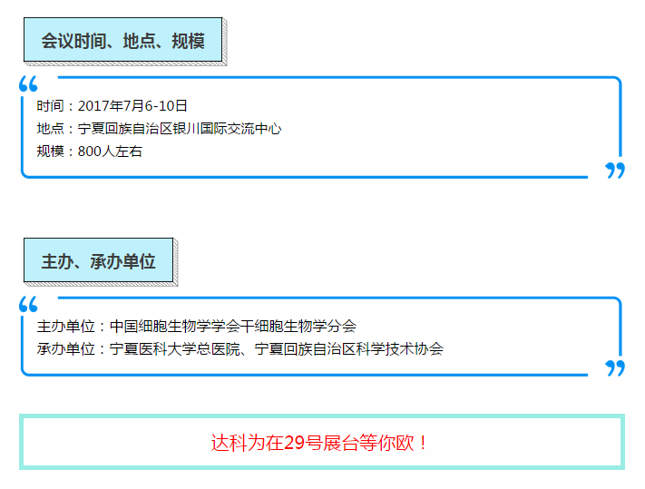 由中國細胞生物學學會干細胞生物學分會主辦,寧夏醫科大學總醫院和寧夏科學技術協會共同承辦的“中國干細胞第七屆年會”,將于2017年7月6日至10日在寧夏回族自治區銀川國際交流中心召開。本屆年會主題為:干細胞研究與轉化——破冰之旅。達科為也在本次會議中積極響應,達科為&PeproTech攜手合作,恭祝中國干細胞第七屆年會取得成功!