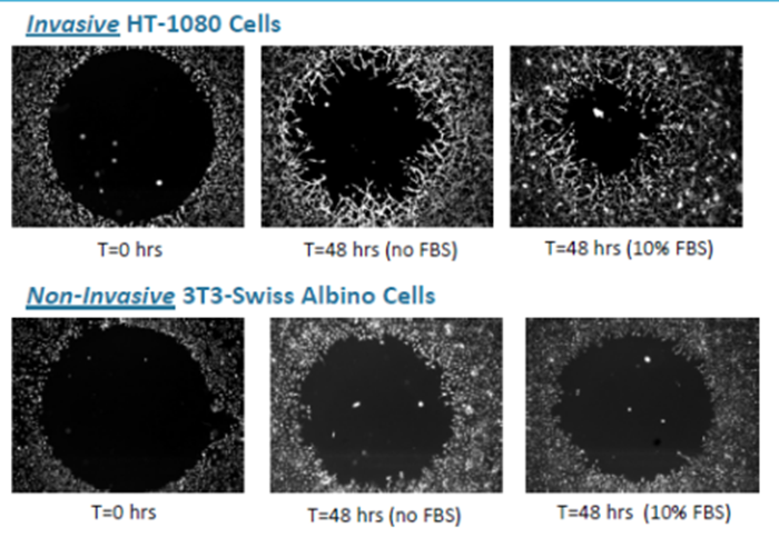 Platypus公司提供了遷移/侵襲新思路,利用間隙封閉法來(lái)實(shí)現(xiàn)最接近體內(nèi)狀態(tài)的細(xì)胞遷移和侵襲。不用再穿越物理性的膜(如Transwell),也避免了劃痕的不均一性,原理如下:
