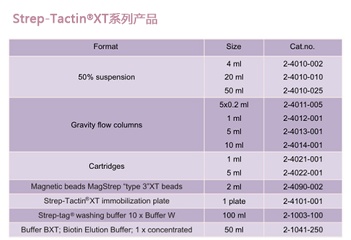 Strep-tag?IBA lifesciences基于生物素(Biotin)和鏈霉親和素(Streptavidin)之間的結合反應開發的蛋白純化系統。第三代Strep-tag?系統:「Strep-Tactin?XT:Twin-Strep-tag?」蛋白純化系統,其結合力可達pM級別但仍保持結合的可逆性和固定化蛋白的溫和復蘇能力。因此,用Strep-Tactin?XT系統能有效提高您目標蛋白的純度,解決您實驗中所遇到的常見問題。