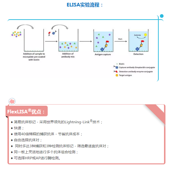 Innova Biosciences FlexLISA?主要是用于開發和優化雙抗體夾心ELISA,將抗體對分別與Streptavidin和HRP/AP標記,然后將樣本和標記抗體對分別加入預包被Biotin 96孔板,室溫孵育1小時,清洗后加入酶檢測試劑即可實現檢測。