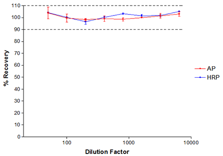 4. 步驟:在鏈酶親和素標記CRP捕獲抗體和HRP/AP標記CRP檢測抗體存在下,耗盡CRP的人血清加到250pg/ml CRP并連續稀釋后加到透明的96條板狀板中;