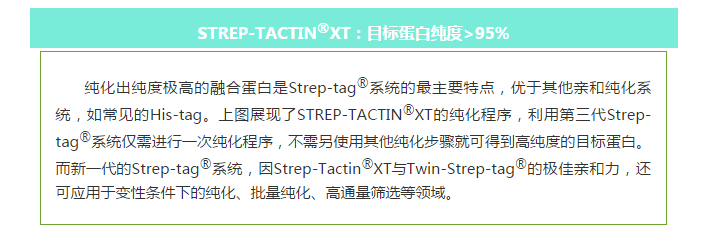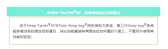 Strep-tag?是IBA life sciences基于生物素(Biotin)和鏈霉親和素(Streptavidin)之間的結(jié)合反應(yīng)開發(fā)的蛋白純化系統(tǒng)。第三代Strep-tag?系統(tǒng):「Strep-Tactin?XT:Twin-Strep-tag?」蛋白純化系統(tǒng),其結(jié)合力可達(dá)pM級別但仍保持結(jié)合的可逆性和固定化蛋白的溫和復(fù)蘇能力。因此,用Strep-Tactin?XT 系統(tǒng)能有效提高您目標(biāo)蛋白的純度,解決您實驗中所遇到的常見問題。