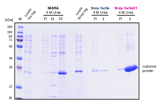 以SDS-PAGE分析發現,使用第三代Strep-tactin?XT能在使用6M尿素的變性條件下,得到大量高純度的蛋白;使用Strep-tactin?(4M尿素)得到蛋白量較少。而使用Ni-NTA雖然能在將pH值調降至4.5(E2)情況下,純化出靶蛋白,但得到的最終產物仍含有許多雜質。