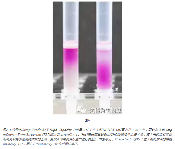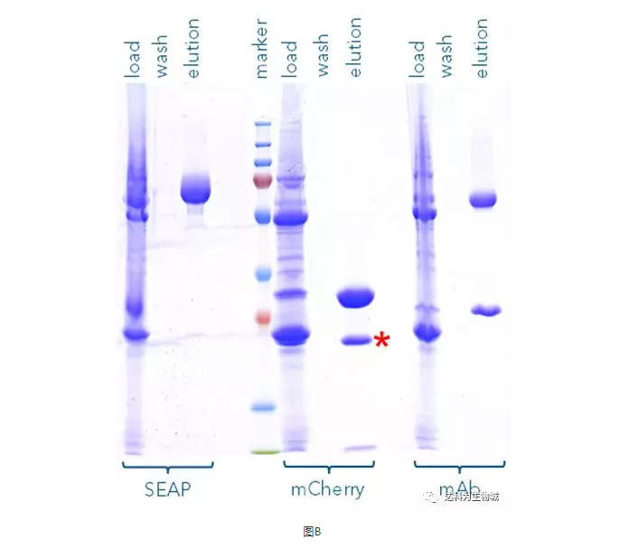 此外,我們也測試了其他的蛋白,例如SEAP(72 kDa)或抗體(mAb,其重鏈為55kDa)。圖B為以Strep-Tactin?XT純化SEAP-TST、mCherry-TST與mAb-TST的SDS-PAGE分析結果,可見對于不同蛋白,Strep-tag?系統都能純化出高純度的目標蛋白。(注:紅色標記處為 mCherry的降解產物,非雜帶)