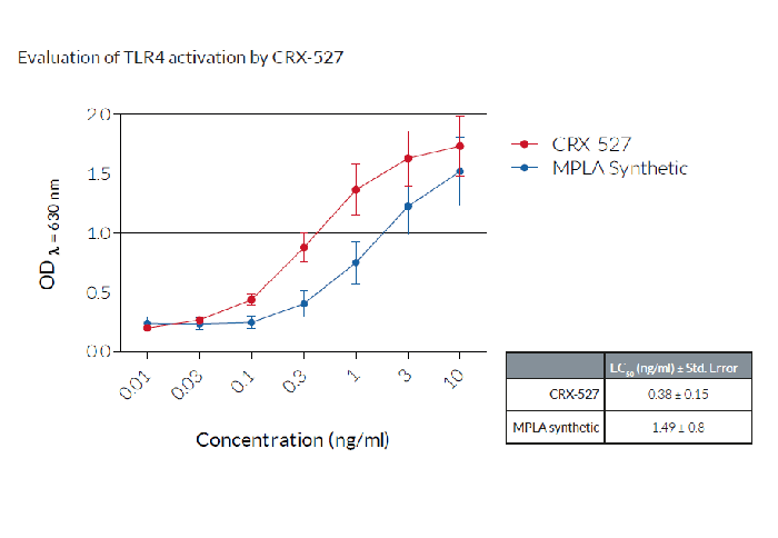 將細胞分別與遞增濃度的CRX-527、合成的單磷酰脂質A(MPLA)孵育。在HEK-BlueTM檢測培養(yǎng)基(SEAP檢測生長培養(yǎng)基)中孵育過夜后,通過測定上清液中是否存在SEAP來評估TLR4的活化。數(shù)據(jù)表示為OD(λ=630nm)(±SEM)