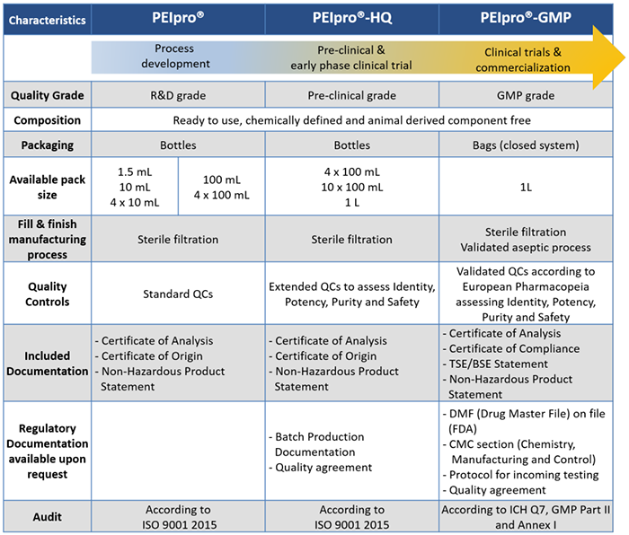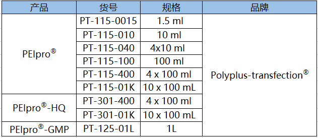 表1.Polyplus-transfection?提供一系列不同級(jí)別PEIpro?,滿(mǎn)足從工藝開(kāi)發(fā)、臨床前、到臨床級(jí)別病毒載體的生產(chǎn)需求