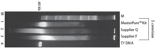 1%瓊脂糖膠電泳分析不同試劑盒提取純化啤酒酵母的500ng DNA,使用EB進行染色。用MasterPure? Kit分離的DNA的大小絕大多數在40-50 kb范圍內。用其它試劑盒提取的DNA會降解成更小的片段。