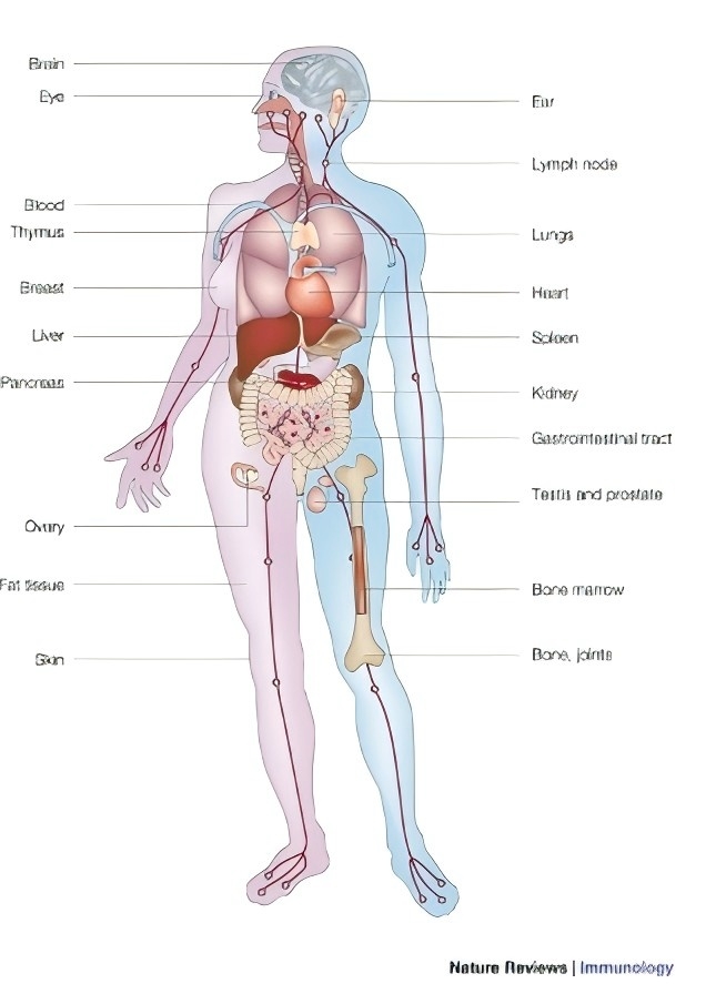 起初,T 細胞被認為是免疫系統中 MIF 的主要細胞來源。然而,后來的文獻證明了單核細胞、巨噬細胞、血液中的樹突狀細胞、B 細胞、中性粒細胞、嗜酸性粒細胞、肥大細胞和嗜堿性粒細胞均表達MIF。值得注意的是,MIF 也由與宿主自然環境直接接觸的細胞和組織表達,例如肺、皮膚上皮層以及胃腸道和泌尿生殖道。其另一個顯著特征是在內分泌系統的幾個組織中高水平表達,尤其是參與應激反應的器官(下丘腦、垂體和腎上腺)。