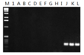 △Fig 1.使用FailSafe? PCR PreMix Selection Kit擴(kuò)增高GC含量的模板。擴(kuò)增人的ApoE gene中GC含量為75%的片段,M:molecular marker;1:使用MasterAmp Taq DNA聚合酶的標(biāo)準(zhǔn)緩沖液條件;A-L:使用12 種FailSafe 2X PCR PreMix 分別進(jìn)行擴(kuò)增。