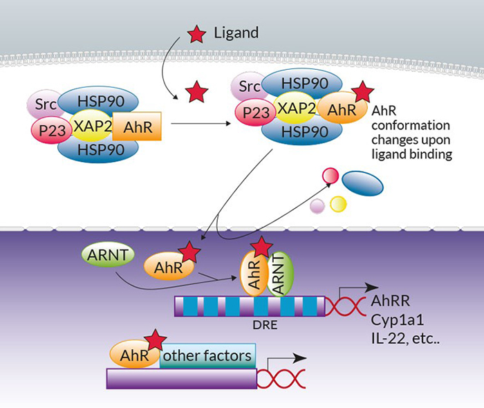 典型AhR訊號已經被廣泛綜述過1。簡而言之,在沒有配體的情況下,AhR位于細胞質中Hsp90:XAP2:p23:Src伴侶蛋白復合物內,當配體結合時,復合物發生構象變化并轉移到細胞核中。伴侶蛋白被釋放,AhR和AhR核轉位子(ARNT)異源二聚。在細胞核中,AhR:配體:ARNT三聚體與AhR靶基因上游調節區域的二噁英應答元件(DRE)結合,以控制包括細胞色素P450依賴性單加氧酶Cyp1a1、AhR 抑制因子(AhRR)和IL-22白細胞介素的轉錄。值得注意的是,無輪是在基因組水平上通過與其他轉錄因子(例如NF-κB)相關聯,還是在非基因組水平上(例如通過釋放Src激酶),非典型AhR信號通路也有被報道過2,3