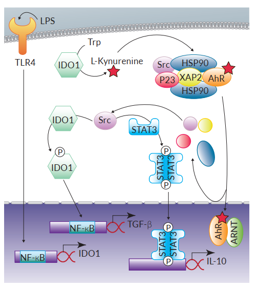 AhR參與調節促炎反應和耐受反應的機制可以從多方面解釋,除了前文提過可以導致IL-22產生的典型AhR信號,AhR也通過非基因組途徑導致至少兩個抑制性效果。研究發現與AhR相關的Src激酶能夠磷酸化吲哚胺2,3-雙加氧酶(IDO1),進而激活NF-κB轉錄因子誘導DCs中抑制性細胞因子TGF-β(transforminggrowth factor)的轉錄,達到抑制小鼠對LPS的過度應答9。此外, IDO1對Trp的降解提供了例如L-型犬尿氨酸(L-Kynurenine)的AhR激動劑,提示了這通路與Treg的產生有關9。在巨噬細胞中,AhR另一個抑制作用是在LPS誘導下,AhR協同Src激酶和STAT3信號通路產生抗炎細胞因子IL-10。值得留意的是,TLR4對LPS的識別可促進巨噬細胞中AhR的表達,但目前尚不清楚在其他模式識別受體配體刺激的情況下是否也是如此10