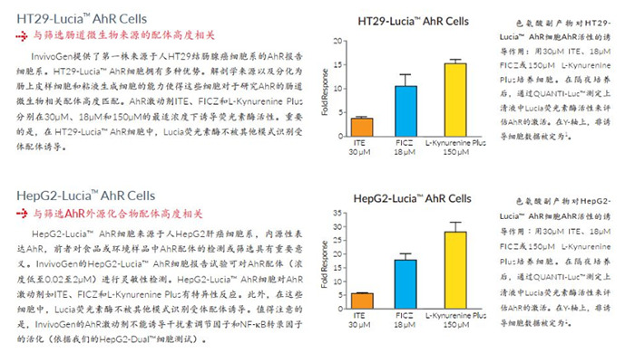 InvivoGen提供兩個AhR報告細胞系,分別改造自人HT29結腸腺癌和HepG2肝癌細胞系。HT29-Lucia?AhR細胞和HepG2-Lucia? AhR細胞有助于研究AhR激活作用,可以幫助了解多種激動劑如外源物質和飲食衍生的吲哚產物對AhR的激活反應。最重要的是,我們的AhR報告細胞是人源細胞,并且內源性表達人AhR,這使得它們與人類樣本中篩選內源性AhR激動劑高度相關。