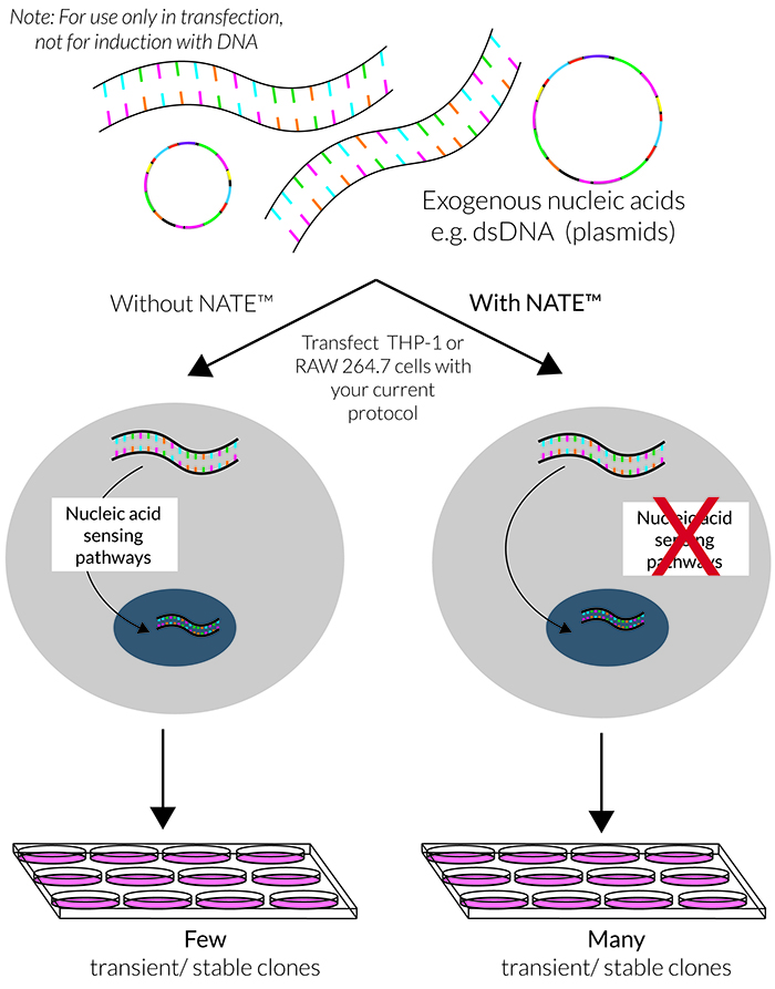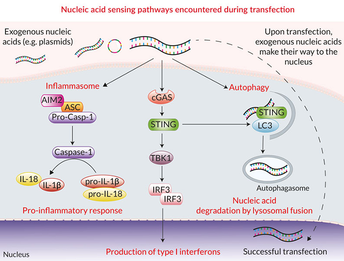 在真核細胞轉(zhuǎn)染期間,外源核酸(如質(zhì)粒DNA)的主要障礙是它們會被胞質(zhì)傳感器檢測,如cGAS/STING,AIM2炎癥小體和LC3介導的自噬。這些防御性級聯(lián)信號的激活通常會導致低轉(zhuǎn)染效率、降低的細胞活力和不一致的結果,尤其是在難轉(zhuǎn)細胞(如免疫細胞)的轉(zhuǎn)染實驗中。NATE?抑制許多核酸感應途徑,從而保護外源DNA并促進其表達。