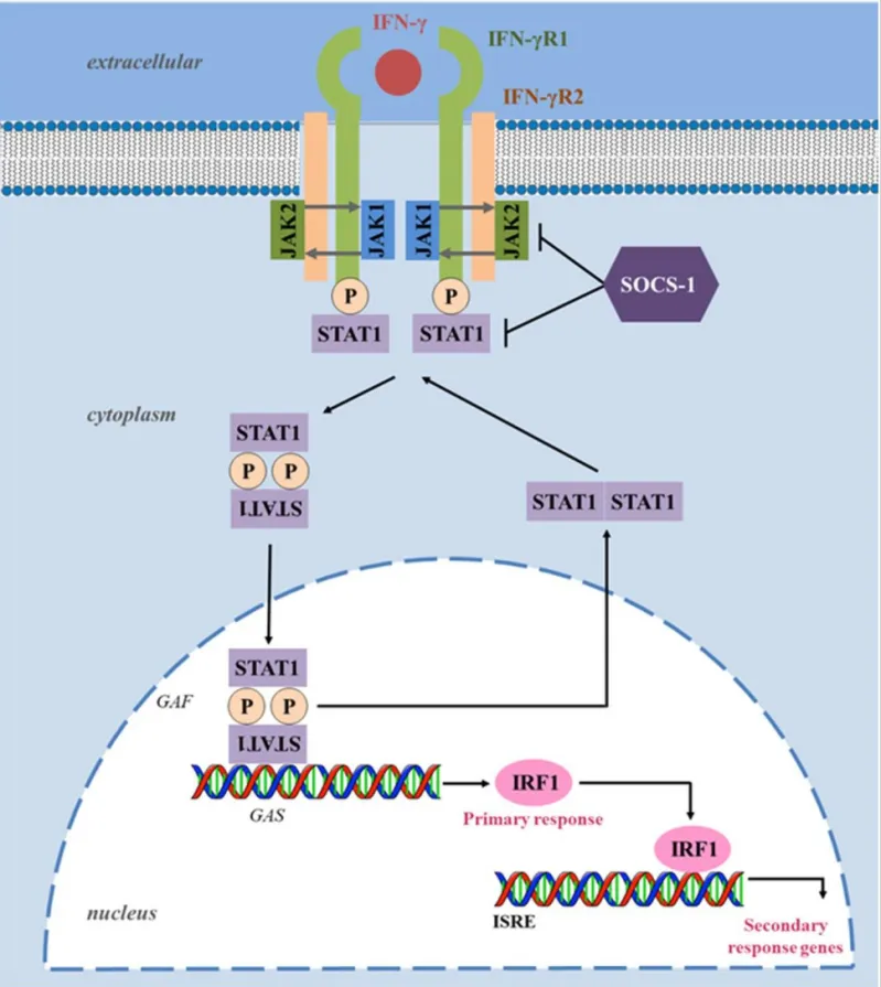 IFN-γ信號通路協調多種生物反應,在先天和適應性免疫中扮演的重要角色。IFN-γ可以通過促進Th1細胞、CD8+T淋巴細胞、NK細胞、樹突狀細胞及巨噬細胞的活性,抑制Treg、Th2和Th17細胞分化和功能,發揮免疫調節作用。此外,IFN-γ可激活巨噬細胞,使其分化為M1型巨噬細胞。